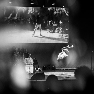 The moment the shadow of the arial performer entered the projected image of the musicians performing in Gaza. The breakdancer entering the stage with a backflip, moving with his equal on the other side of the screen. Joined improvisations, the story about an unexploded bomb in front of the narrators´ home. It all was just so epic and just about the most meaningful action one could take at this moment in time.